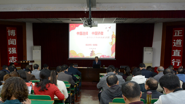 會上,我校圖書館館長楊增強教授作了題為《中國選擇 中國驕傲——新中國七十年來的成就與思考》的專題報告,報告講述了新中國波瀾壯闊、激情澎湃、創(chuàng)意萬千、日新月異的歷史性巨變,圍繞“七十年來新中國取得的成就”“七十年來新中國的歷史定位”“七十年來新中國發(fā)展的思考”“對未來發(fā)展的展望”四個方面進行了詳細的講解。