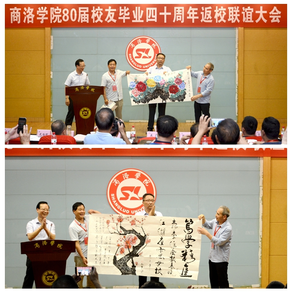 商洛學(xué)院80屆校友總聯(lián)絡(luò)人孟軍,在聯(lián)誼大會(huì)上代表全體校友感謝學(xué)校對(duì)此次活動(dòng)的重視和支持,并現(xiàn)場(chǎng)贈(zèng)送《桃李清風(fēng)報(bào)春曉·江湖夜雨思母?!贰赌档D》等書(shū)畫(huà)作品表達(dá)對(duì)母校的深情厚意。他在發(fā)言中表示,憶往昔,歲月崢嶸,母校承載了一代人的青春時(shí)光,不管如今身在何方,故土的鄉(xiāng)情、母校的恩情、師生的友情都絕不能忘;看今朝,倍加珍惜,80屆校友們親身經(jīng)歷了祖國(guó)改革開(kāi)放40年的發(fā)展變化、親眼目睹了母校翻天覆地的發(fā)展壯大,這些來(lái)之不易的成果需要我們共同呵護(hù)珍惜;講未來(lái),豪情滿懷,如今的祖國(guó)屹立于世界之林,揚(yáng)起了大國(guó)的風(fēng)帆,如今的商洛學(xué)院作為陜西省“一流學(xué)院”建設(shè)單位,已成長(zhǎng)為一棵枝繁葉茂的大樹(shù),站在新時(shí)代的節(jié)點(diǎn)展望未來(lái)的發(fā)展,我們信心滿滿。衷心祝愿祖國(guó)的明天更美好、母校的未來(lái)錦繡如花。