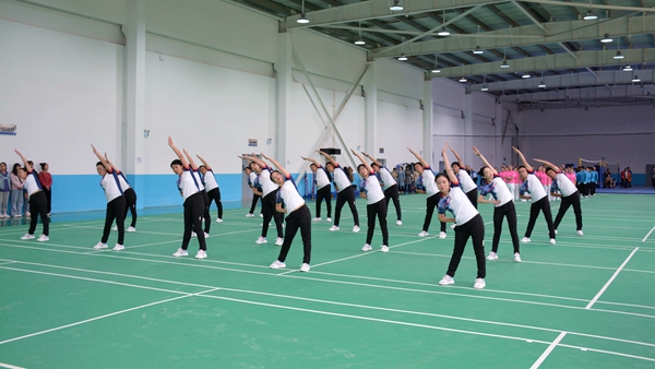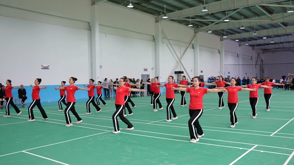 12支參賽隊伍邁著矯健的步伐依次入場,參賽隊員們服裝統(tǒng)一、精神抖擻、步伐整齊,隨著第九套廣播體操激情、歡快的音樂聲,舉手、抬腳、彎腰、轉(zhuǎn)身、跳躍,精神飽滿、動作有力、節(jié)奏合拍、隊形整齊,用優(yōu)美的身姿展現(xiàn)商洛學院教職工朝氣蓬勃的精神風貌,獲得現(xiàn)場觀眾陣陣掌聲。