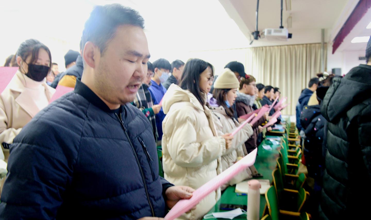——組織參加國家憲法日“憲法晨讀”活動。12月4日上午,校黨委副書記劉勇,宣傳部、學(xué)工部、團(tuán)委負(fù)責(zé)人,和馬克思主義學(xué)院法學(xué)專業(yè)教師、二級學(xué)院師生代表190人,在1號樓報告廳二共同收看、參與了教育部普法網(wǎng)平臺直播的“憲法晨讀”活動。上午9:00,全體起立,跟隨直播現(xiàn)場行注目禮、唱國歌、跟讀憲法條款內(nèi)容,與北京主會場同唱《憲法伴我們成長》歌曲,觀看了優(yōu)秀學(xué)生代表的現(xiàn)場展演。大家表示,通過參加晨讀活動,進(jìn)一步強(qiáng)化了憲法意識,增強(qiáng)了愛國主義情感,我們要帶頭學(xué)習(xí)、宣傳憲法內(nèi)容,讓憲法精神在校園扎根。