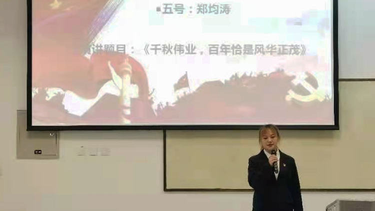比賽中,9名參賽通過精彩的演講重溫黨的光輝歷史、歌頌黨的豐功偉績,傳遞新時代青年對黨的忠誠和對未來的無限憧憬,他們富有感染力的演講深深打動了每一位評委和在場的觀眾,贏得了陣陣掌聲。期間,全體人員起立共唱《我和我的祖國》,用優(yōu)美的歌聲表達對祖國的無限熱愛之情,并重溫入黨誓詞,表達一心向黨、永遠跟黨走的堅定決心。