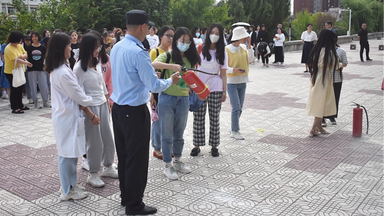 報告結(jié)束后,參會師生集體來到二號樓北側(cè)平臺,由保衛(wèi)處治安科科長張柯講解演示了滅火器的相關(guān)知識及使用方法,并現(xiàn)場指導(dǎo)師生正確使用滅火器。