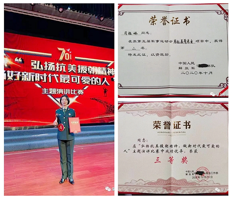 周雅琳從小就有一顆熾熱的軍人夢(mèng),2019年她積極響應(yīng)國(guó)家號(hào)召,踴躍應(yīng)征入伍,現(xiàn)為火箭軍某部戰(zhàn)士。在部隊(duì)上,她認(rèn)真工作,嚴(yán)格按照標(biāo)準(zhǔn)完成各項(xiàng)任務(wù),積極參加各項(xiàng)活動(dòng),參加單位“弘揚(yáng)抗美援朝精神,當(dāng)好新時(shí)代最可愛的人”主題演講比賽,榮獲三等獎(jiǎng)。自主加強(qiáng)體能訓(xùn)練,參加軍事運(yùn)動(dòng)會(huì)單杠屈臂懸重項(xiàng)目,獲得第二名。參加春晚排練及慰問演出等文藝活動(dòng),受到指導(dǎo)員和戰(zhàn)友們的一致肯定。同時(shí),她愛好樂器演奏,還是單位軍樂隊(duì)單簧管演奏員。