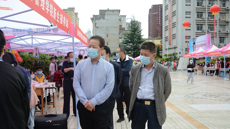 在黨委辦公室·院長(zhǎng)辦公室、學(xué)工部、教務(wù)處相關(guān)負(fù)責(zé)人的陪同下,張志昌、范新會(huì)一行來到各二級(jí)學(xué)院新生接待站,詳細(xì)了解新生報(bào)到情況,對(duì)工作人員和學(xué)生志愿者飽滿的精神狀態(tài)和熱情周到的服務(wù)給予充分肯定。校領(lǐng)導(dǎo)們還與現(xiàn)場(chǎng)報(bào)到的新生及家長(zhǎng)親切交談,詢問他們對(duì)迎新工作的意見建議,叮囑新生要盡快適應(yīng)大學(xué)生活,積極做好職業(yè)規(guī)劃,精進(jìn)學(xué)業(yè),增長(zhǎng)才干,砥礪奮進(jìn),實(shí)現(xiàn)夢(mèng)想。