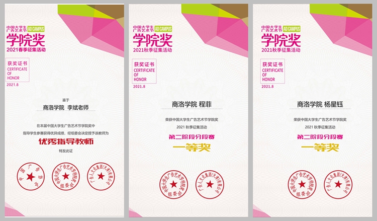 近日,2021年中國大學(xué)生廣告藝術(shù)節(jié)學(xué)院獎(jiǎng)大賽秋季第二分段賽圓滿結(jié)束,我校獲得一等獎(jiǎng)2項(xiàng),二等獎(jiǎng)3項(xiàng),三等獎(jiǎng)2項(xiàng),優(yōu)秀獎(jiǎng)1項(xiàng),入圍獎(jiǎng)16項(xiàng),1名教師獲得“優(yōu)秀指導(dǎo)教師”,這是我校參加此類比賽首次獲獎(jiǎng)。