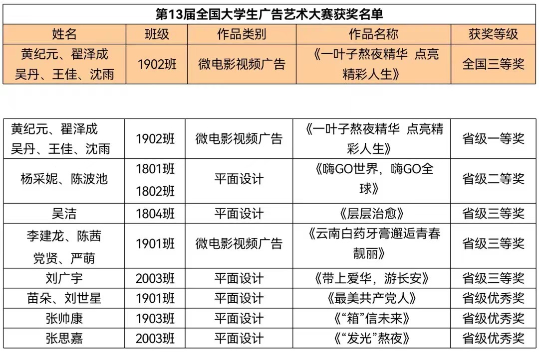 本屆大賽開辟了微電影廣告視頻類新賽道,由藝術(shù)學(xué)院教師楊靜指導(dǎo)的微電影廣告視頻類作品《一葉子熬夜精華點(diǎn)亮精彩人生》獲得國(guó)家級(jí)三等獎(jiǎng)和省級(jí)一等獎(jiǎng)、《云南白藥牙膏邂逅青春靚麗》獲得省級(jí)三等獎(jiǎng);在平面設(shè)計(jì)類賽道中,藝術(shù)學(xué)院教師王曦茜指導(dǎo)的《嗨GO世界,嗨GO全球》獲得省級(jí)二等獎(jiǎng),教師王子瑋指導(dǎo)的《層層治愈》榮獲省級(jí)三等獎(jiǎng),教師楊靜指導(dǎo)的《帶上愛華游長(zhǎng)安》榮獲省級(jí)三等獎(jiǎng)、《最美共產(chǎn)黨人》獲得省級(jí)優(yōu)秀獎(jiǎng),教師張中義指導(dǎo)的《“發(fā)光”熬夜》、教師余鑫指導(dǎo)的《“箱”信未來》獲得省級(jí)優(yōu)秀獎(jiǎng)。