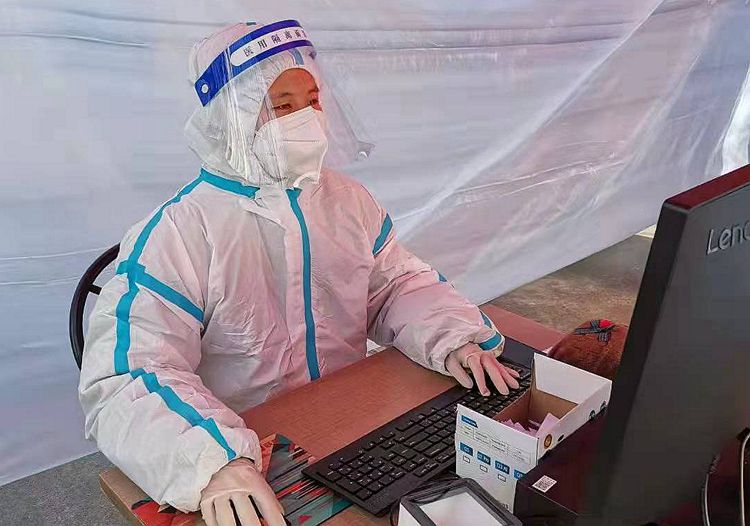 (王丹彤在核酸采樣點(diǎn)開(kāi)展老幼身份信息輸入工作)