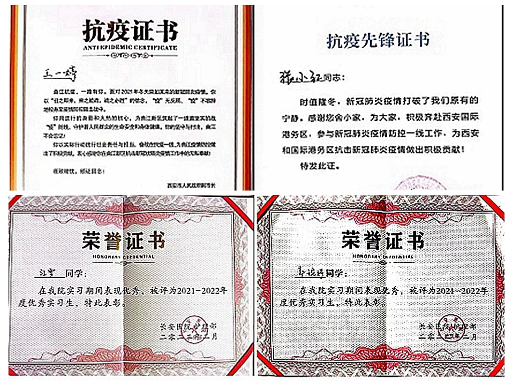 近日,西安曲江新區(qū)和國(guó)際港務(wù)區(qū)對(duì)抗擊新冠肺炎疫情工作中表現(xiàn)突出的工作人員和志愿者進(jìn)行了表彰。我校王一婷、張小紅、郭江艷、崔晉維、高靜、郭婉婷6名實(shí)習(xí)生榮獲西安曲江新區(qū)和國(guó)際港務(wù)區(qū)頒發(fā)的抗疫證書和抗疫先鋒證書。學(xué)生江雪榮獲西安國(guó)際港務(wù)區(qū)頒發(fā)的抗疫先鋒證書。張小紅、郭婉婷及江雪3名實(shí)習(xí)生被長(zhǎng)安醫(yī)院評(píng)為“優(yōu)秀實(shí)習(xí)生”。