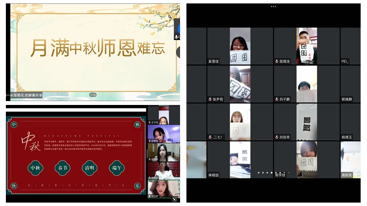 人文學(xué)院以“月滿中秋,難忘師恩”為主題舉辦線上活動(dòng)。師生共讀傳統(tǒng)古詩、分享家鄉(xiāng)中秋習(xí)俗,學(xué)生們通過“云端”向老師們送來熱情的祝福,表達(dá)了自己對(duì)大學(xué)生活的憧憬。