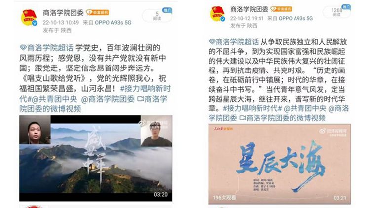 “接力唱響新時(shí)代”微博接力活動(dòng)通過(guò)發(fā)布歌唱視頻的方式參與微博話題。校團(tuán)委組織藝術(shù)學(xué)院優(yōu)秀學(xué)子傾情演唱《星辰大海》《唱支山歌給黨聽(tīng)》《我愛(ài)你,中國(guó)》《國(guó)家》以及《我的祖國(guó)》等紅色歌曲,以此唱響心中理想、唱出青春最強(qiáng)音,以青春的姿態(tài)、昂揚(yáng)的歌聲抒發(fā)對(duì)黨的誠(chéng)摯熱愛(ài)和深厚情感。