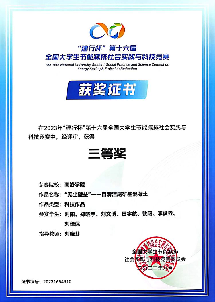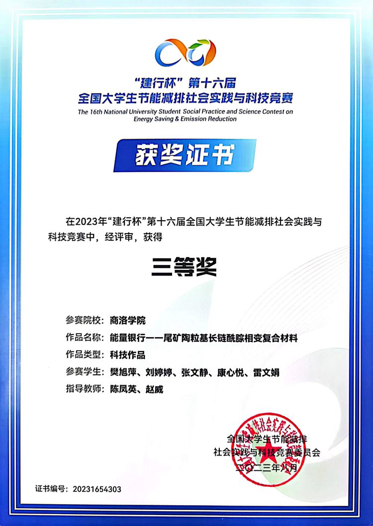 近日,由教育部高等學(xué)校能源動(dòng)力類(lèi)專(zhuān)業(yè)教學(xué)指導(dǎo)委員會(huì)指導(dǎo),全國(guó)大學(xué)生節(jié)能減排社會(huì)實(shí)踐與科技競(jìng)賽委員會(huì)主辦的“建行杯”第十六屆全國(guó)大學(xué)生節(jié)能減排社會(huì)實(shí)踐與科技競(jìng)賽決賽在東南大學(xué)舉行。經(jīng)過(guò)激烈角逐,化材學(xué)院劉曉芬博士指導(dǎo)完成的作品《“無(wú)塵壁壘”——自清潔尾礦基混凝土》、陳鳳英教授、趙威副教授聯(lián)合指導(dǎo)完成的作品《能量銀行——尾礦陶粒基長(zhǎng)鏈酰腙相變復(fù)合材料》從全國(guó)近7000件作品中脫穎而出,榮獲國(guó)賽三等獎(jiǎng)。