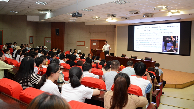 姚峰教授以《多變量時(shí)間序列因果分析的理論與應(yīng)用》為題,通過(guò)對(duì)諾貝爾經(jīng)濟(jì)學(xué)獎(jiǎng)獲得者Granger和Sims的介紹引出近年來(lái)關(guān)于時(shí)間序列因果關(guān)系方面的研究,介紹多個(gè)時(shí)間序列之間的因果關(guān)系、單方向因果測(cè)量的Wald檢驗(yàn)。報(bào)告結(jié)束后,姚峰教授就統(tǒng)計(jì)建模思想的運(yùn)用與參會(huì)師生進(jìn)行了交流與互動(dòng)。