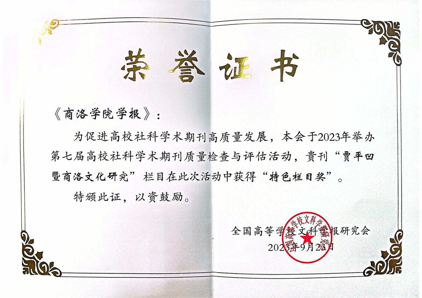 全國高等學校文科學報研究會舉辦的2023年(第七屆)高校社科學術期刊質量檢查與評估活動結果日前公布,我校學報“賈平凹暨商洛文化研究”欄目獲“全國高校社科期刊特色欄目獎”。這是繼“陜西高校精品社科期刊”和“優(yōu)秀欄目獎”之后,我校學報今年取得的又一佳績。