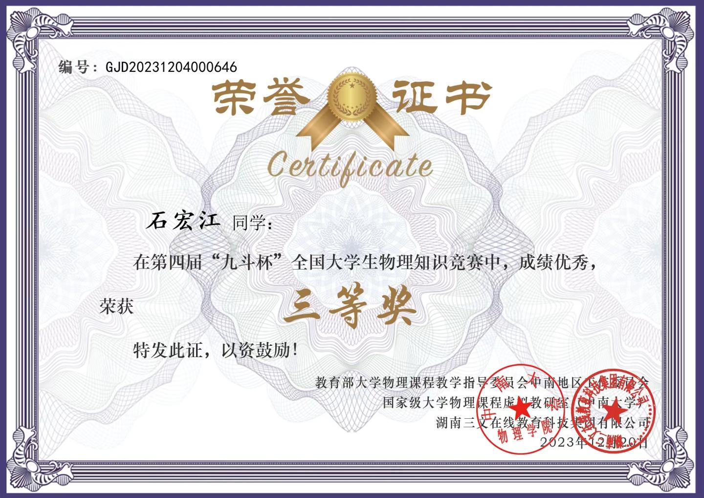 近日,由教育部大學(xué)物理課程教學(xué)指導(dǎo)委員會(huì)中南地區(qū)工作委員會(huì)、國(guó)家級(jí)大學(xué)物理課程虛擬教研室主辦的第四屆“九斗杯”全國(guó)大學(xué)生物理知識(shí)競(jìng)賽結(jié)果揭曉。我校電信學(xué)院學(xué)生石宏江、閆露、楊悅、賀楊在決賽中喜獲全國(guó)三等獎(jiǎng)。