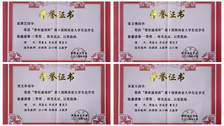 近日,由陜西省化學會和陜西省高等學?;瘜W實驗中心聯(lián)席會主辦、陜西理工大學承辦的第十屆陜西省大學生化學實驗邀請賽在陜西理工大學舉行。經(jīng)過激烈角逐,我?;膶W院學生張文博獲一等獎,劉文亭獲二等獎,宋夏天、趙茜藝獲三等獎,我校代表隊榮獲優(yōu)秀團隊獎。