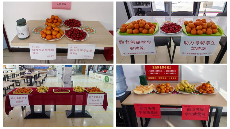 各學(xué)生食堂設(shè)立“考研加油站”,為考研學(xué)生免費(fèi)提供各類水果,冬至當(dāng)天,教工食堂為研究生招生考試考務(wù)人員及工作人員提供了手工水餃。