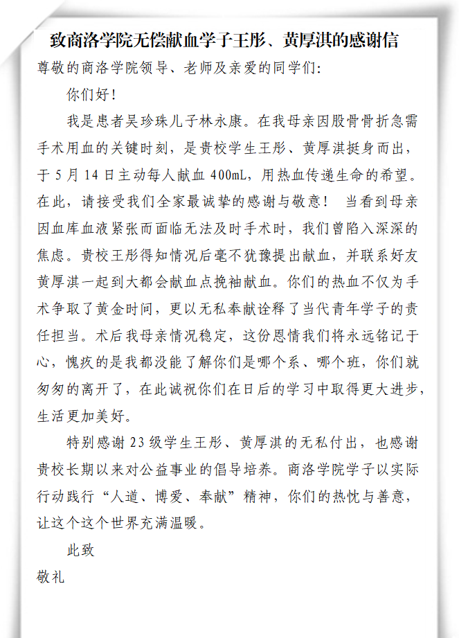 日前,一封字字懇切的感謝信送達商洛學院,患者吳珍珠的兒子林永康在信中深情致謝商洛學院藝術學院音樂2303班的王彤與黃厚淇兩名學子。感謝他們在自己的母親股骨骨折手術因血庫告急而瀕臨推遲的危急時刻,挺身而出,主動獻血800毫升,幫助患者渡過醫(yī)治難關。