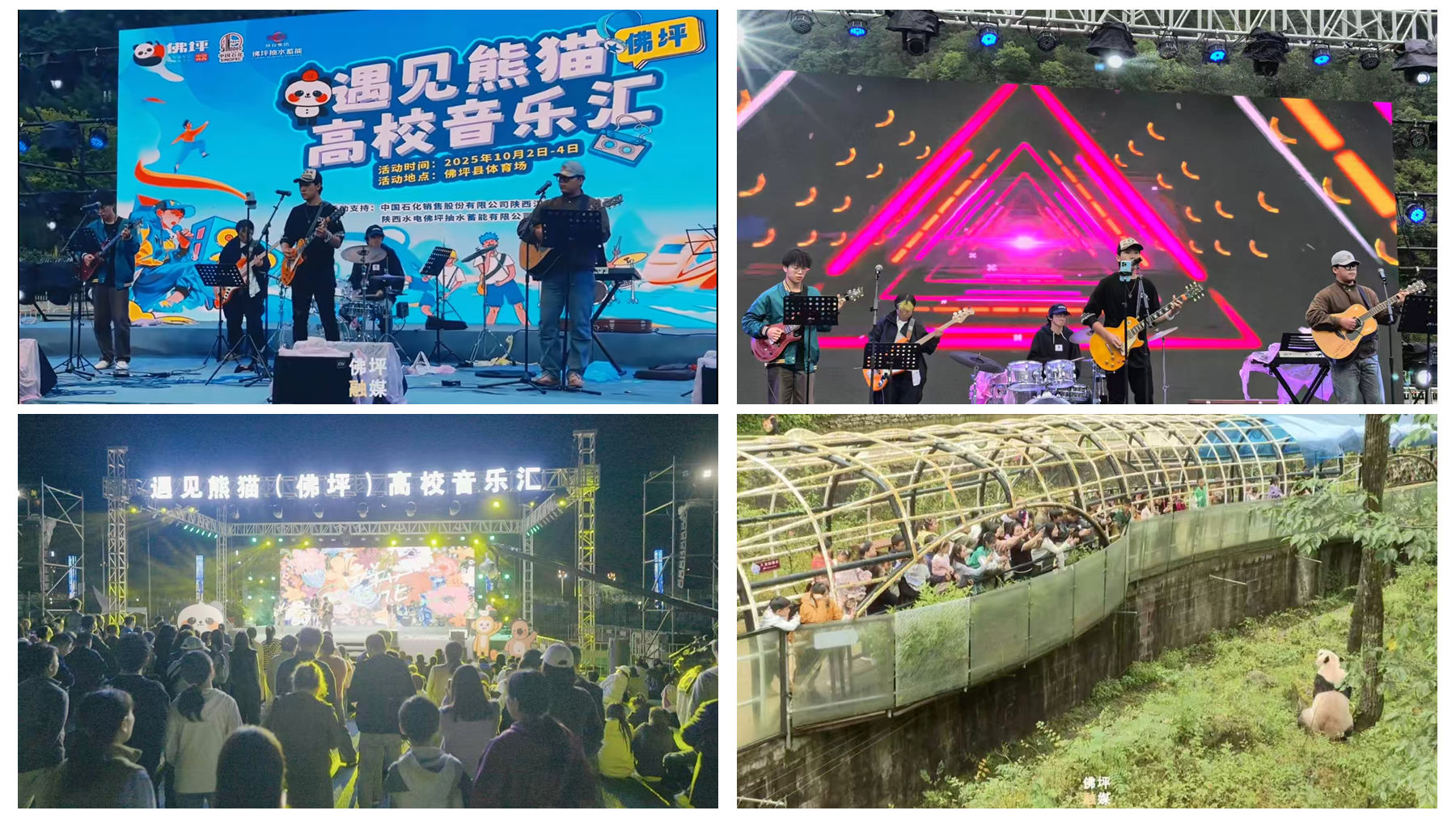 在高校音樂匯環(huán)節(jié),我校大藝團“夢影樂隊”傾情演繹了《流行》《私奔》《活著》《茶底世界》等多首歌曲。同學們憑借扎實的專業(yè)技能和飽滿的舞臺表現(xiàn)力,充分展現(xiàn)了高校學子積極向上的精神風貌,也將現(xiàn)代音樂文化與佛坪獨特的熊貓IP、自然人文景觀有機融合,為現(xiàn)場觀眾帶來一場視聽盛宴,成為“文旅+音樂”跨界融合的生動實踐。