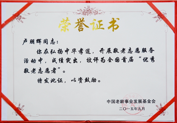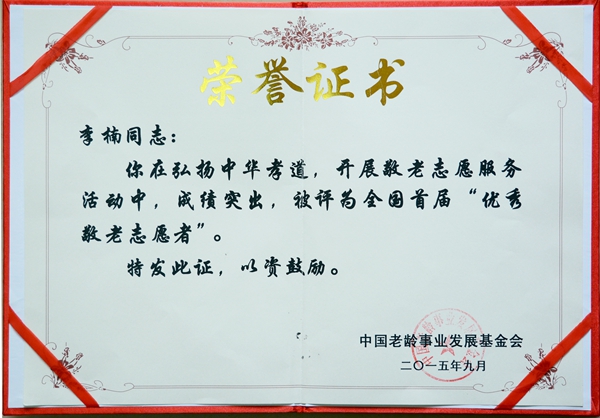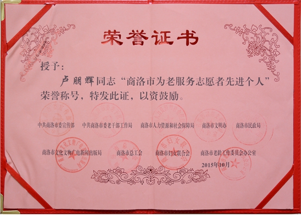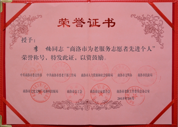 日前,中國(guó)老齡事業(yè)發(fā)展基金會(huì)發(fā)出《關(guān)于表彰全國(guó)首屆北京華夏惠眾養(yǎng)老產(chǎn)業(yè)投資有限公司等百家“敬老志愿服務(wù)模范單位”、溫向明等百名“最美敬老志愿者”、沈慧琴等千名“優(yōu)秀敬老志愿者”的決定》。我校學(xué)生李楠、盧朋輝榮獲全國(guó)首屆“優(yōu)秀敬老志愿者”榮譽(yù)稱號(hào)。同時(shí)二人也獲得商洛市表彰,被評(píng)為“商洛市為老服務(wù)志愿者先進(jìn)個(gè)人”。