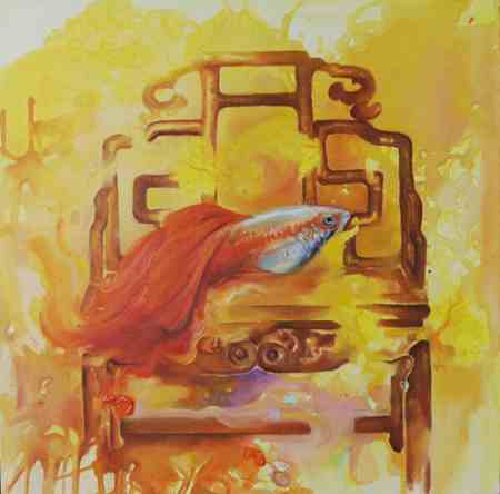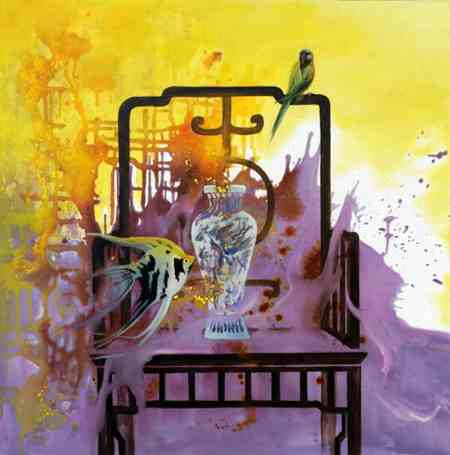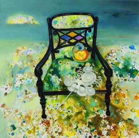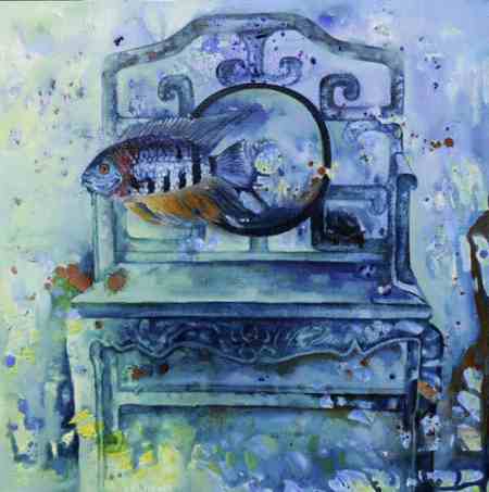 楊靜的作品兼具油畫的西方特質與藝術家個人的東方屬性,多以意象風景為主,魚、飛鳥、椅子、面具、鮮花常常成為畫面中的主要視覺符號,意象化的表述方式是其繪畫語言特點,獨具視覺張力的畫面背后蘊藏著或浪漫或神秘或抒情的藝術獨白?!讹w翔的魚》系列作品承載著對“自然”“生命”“自由”的渴望與理想,“飛翔的魚”穿梭于人間百象,描繪著在經(jīng)歷世事滄桑之后一顆滿懷“游”“逸”的心。作品把中國傳統(tǒng)文化中對莊子美學的研究與領悟融入到西方油畫的創(chuàng)新當中,在中西文化的對撞中融匯出的獨特浪漫氣質是楊靜油畫藝術走出國門并被認可的實質。