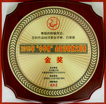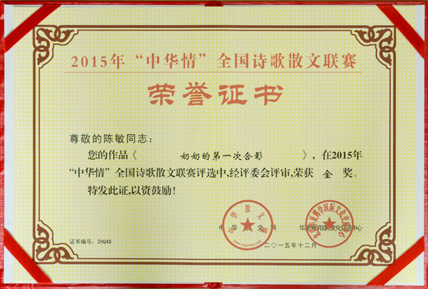 12月5日,2015年“中華情”全國(guó)詩歌散文聯(lián)賽評(píng)選結(jié)果揭曉,在國(guó)內(nèi)外12085篇參評(píng)作品中,我校語言文化傳播學(xué)院教師陳敏創(chuàng)作的作品《奶奶的第一次合影》最終脫穎而出,榮獲2015年“中華情”全國(guó)詩歌散文聯(lián)賽金獎(jiǎng)。