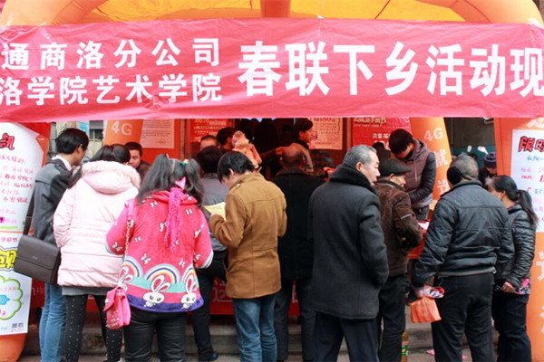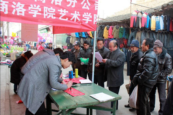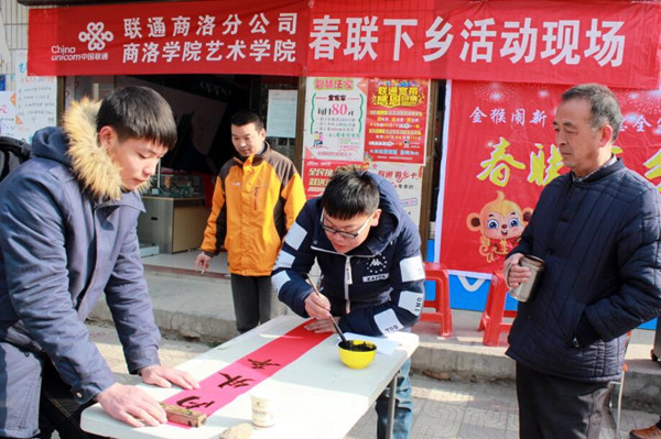 “金猴獻(xiàn)禮家家順利 喜鵲鬧春事事吉祥”,伴隨著新年腳步的臨近,1月16日至26日,由我校藝術(shù)學(xué)院師生組成的寒假社會實踐活動團(tuán)隊聯(lián)合商洛聯(lián)通公司,在全市四縣一區(qū)22個鄉(xiāng)鎮(zhèn)開展了“文化下鄉(xiāng)送春聯(lián)”活動。