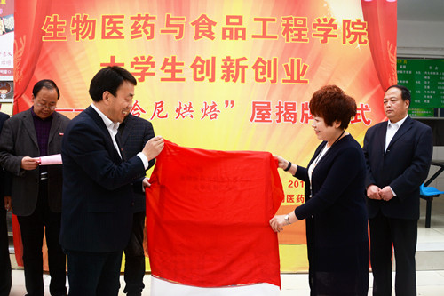 4月11日上午,由我校與陜西森弗天然制品有限公司合作的首個(gè)大學(xué)生創(chuàng)新創(chuàng)業(yè)項(xiàng)目——“哈尼烘焙”屋正式揭牌營業(yè)。校黨委副書記彭虎軍與陜西森弗天然制品有限公司總經(jīng)理金淑霞共同為“哈尼烘焙”屋揭牌。揭牌儀式由生物醫(yī)藥與食品工程學(xué)院黨總支副書記丁爭尚主持。