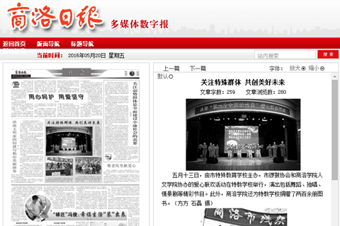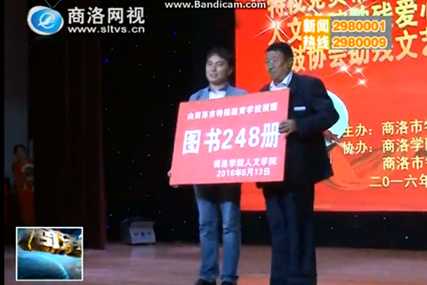 我校人文學(xué)院師生在與商洛市特殊教育學(xué)校聯(lián)辦慶?!暗?6次全國(guó)助殘日”愛心聯(lián)歡公益活動(dòng),并為特教學(xué)校師生捐贈(zèng)愛心圖書的事跡得到了社會(huì)媒體的關(guān)注。近日,商洛日?qǐng)?bào)、商洛電視臺(tái)等新聞媒體紛紛對(duì)此愛心活動(dòng)作了宣傳報(bào)道。
