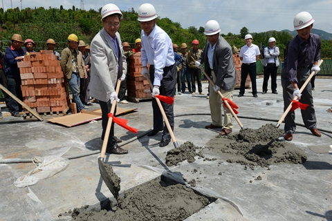 在儀式現(xiàn)場(chǎng),劉寶盈及參加封頂儀式的代表們鏟起混凝土,共同為青年教師公寓和學(xué)生公寓樓封頂。