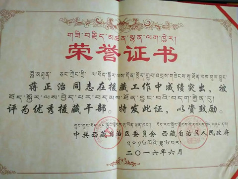 三年來,蔣正治以其優(yōu)良的工作作風(fēng),勤懇的工作態(tài)度,得到了援藏工作隊和受援單位的一致好評。2014年3月,蔣正治被評為陜西省優(yōu)秀援藏干部;2015年7月,被評為優(yōu)秀共產(chǎn)黨員;2014年、2015年連續(xù)兩年被評為中共阿里地委黨校優(yōu)秀教師;2016年被評為中共阿里地委黨校先進(jìn)工作者;在援藏工作結(jié)束之際,他又被中共西藏自治區(qū)委員會、西藏自治區(qū)人民政府評為“優(yōu)秀援藏干部”,受到表彰。