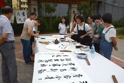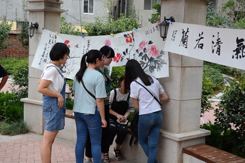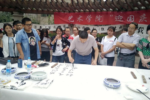 活動中,藝術(shù)學院美術(shù)學專業(yè)教師及學生30余人以筆代言,以畫為媒,通過一幅幅形式多樣,立意新穎的書畫作品,抒發(fā)自己對祖國、對傳統(tǒng)文化的熱愛之情?;顒悠陂g共創(chuàng)作書法、國畫等作品40余幅,引來眾多師生觀摩學習。