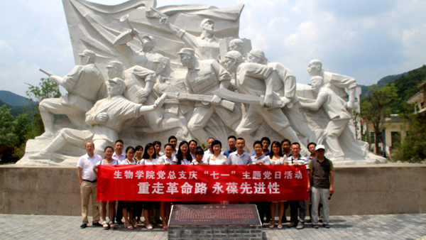 ——生物學(xué)院黨總支舉辦慶“七一”“重走革命路 永葆先進(jìn)性” 活動。為慶祝中國共產(chǎn)黨建黨九十六周年華誕,6月29日,生物學(xué)院黨總支組織23名黨員赴商州區(qū)北寬坪鎮(zhèn)唐渠參觀商洛縣政府遺址、“中原突圍”紀(jì)念雕塑,開展“七一”主題活動,接受紅色革命再教育?;顒悠陂g,黨員們參觀了“中原突圍”紀(jì)念雕塑,重溫中原軍區(qū)沖破重重包圍,歷盡艱難,勝利地完成戰(zhàn)略轉(zhuǎn)移任務(wù)的革命事跡;隨后,參觀了商洛縣政府遺址,并舉行重溫入黨誓詞、合唱《沒有共產(chǎn)黨就沒有新中國》和黨的知識競答等活動。