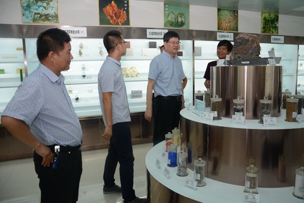 史高領(lǐng)一行深入重點實驗室沙盤標(biāo)本陳列室、有價元素提取室、材料制備室、材料性能檢測室、尾礦無害化處理室等處,詳細(xì)考察了實驗室硬件設(shè)施建設(shè)、配備情況和項目研究工作開展進度。我?;膶W(xué)院院長、尾礦資源綜合利用重點實驗室主任周春生做了詳細(xì)講解。