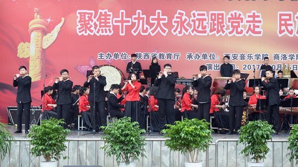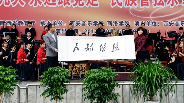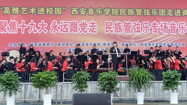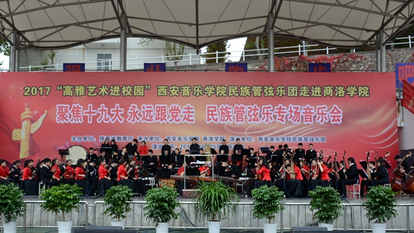 10月25日,由陜西省教育廳主辦的陜西省2017年“高雅藝術(shù)進(jìn)校園”系列活動(dòng)——西安音樂學(xué)院民族管弦樂專場(chǎng)音樂會(huì)在我校舉辦,音樂會(huì)以“聚焦十九大 永遠(yuǎn)跟黨走”為主題。來自西安音樂學(xué)院的85名演員為我校師生奉獻(xiàn)了一場(chǎng)精彩的視聽盛宴。西安音樂學(xué)院紀(jì)委書記劉曉霞、副書記全勇,校領(lǐng)導(dǎo)龍治剛、王思懷、魏書堂、劉寶盈、劉勇,來商參加漢江流域大學(xué)聯(lián)盟宣傳思想工作聯(lián)席會(huì)的代表與全校師生一同欣賞了音樂會(huì)。