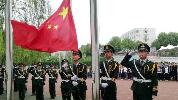 伴隨著激昂雄壯的國歌聲,鮮艷的五星紅旗冉冉升起,迎風(fēng)飄揚(yáng),全體師生隊(duì)列整齊、精神飽滿,向國旗行注目禮。在景觀平臺和操場上晨練的師生聽到國歌聲時也都自覺停下了腳步,原地肅立,向國旗行注目禮。
