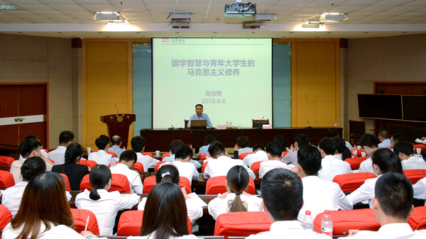 龍治剛從狹義和廣義兩個角度為同學(xué)們講解了國學(xué)的含義,并以四部分類法對國學(xué)進(jìn)行分類,簡要介紹了《經(jīng)》《史》《子》《集》各部的主要內(nèi)容。他引用鄧衛(wèi)東的國學(xué)史觀,結(jié)合自己的親身感受,從不同側(cè)面,用生動的事例、精辟的語言全方位闡述了“自然國學(xué),生命國學(xué),家庭國學(xué),公益國學(xué)”。他以孔子的人生經(jīng)歷為背景,重點講述了儒家思想“仁”“禮”“中庸”“義”“信”的深刻內(nèi)涵,點面結(jié)合,將中國傳統(tǒng)思想文化里的國學(xué)智慧娓娓道來。此外,龍治剛還從修身之道、廉政之道、法治之道、民本之道等七個方面入手,結(jié)合儒釋道文化起源和核心思想,巧妙地將優(yōu)秀傳統(tǒng)文化、現(xiàn)代教育理念、當(dāng)代青年的馬克思主義修養(yǎng)融貫一體,以生動有趣的語言引領(lǐng)青年大學(xué)生了解中國優(yōu)秀傳統(tǒng)文化中的思想精華,引導(dǎo)青年學(xué)子樹立正確的世界觀、人生觀和價值觀。
