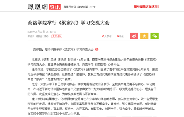 6月27日,我校召開慶祝建黨97周年表彰先進(jìn)暨《梁家河》學(xué)習(xí)交流大會,師生同臺深情誦讀《梁家河》經(jīng)典章節(jié),重溫革命歷史和崢嶸歲月,交流學(xué)習(xí)《梁家河》心得體會,共聚一堂熱烈慶祝黨的生日。活動舉辦后,《陜西日報(bào)》、陜西省教育廳網(wǎng)站、陜西黨建網(wǎng)、中華誦網(wǎng)站、華商頭條、搜狐網(wǎng)、鳳凰網(wǎng)、三秦網(wǎng)、《商洛日報(bào)》等媒體紛紛進(jìn)行報(bào)道,取得了良好的傳播效果,營造了濃厚的《梁家河》學(xué)習(xí)宣傳氛圍。