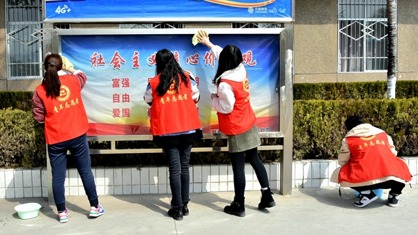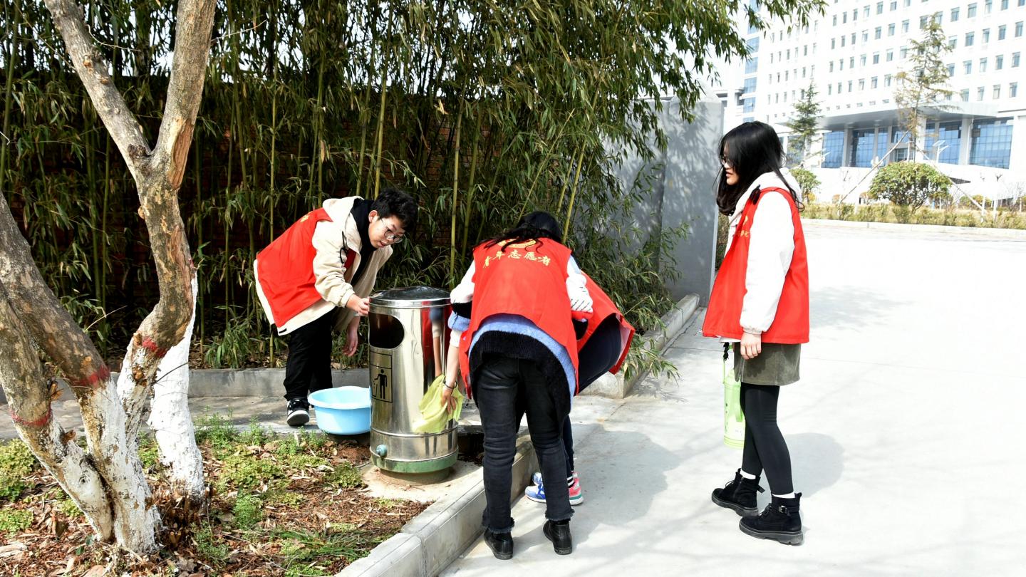 隨后,百余名志愿者參加了以“學習雷鋒精神,凈化美麗校園”為主題的校園美化活動。志愿者們分為三組,有的擦拭閱報欄、垃圾桶,有的撿拾校園垃圾,大家各司其職、有條不紊,手拿抹布、水盆等清潔用具,在校園的各個角落忙碌,用實際行動守護美麗、文明、衛(wèi)生的校園環(huán)境,用熱情和汗水為春日的校園增色添彩。