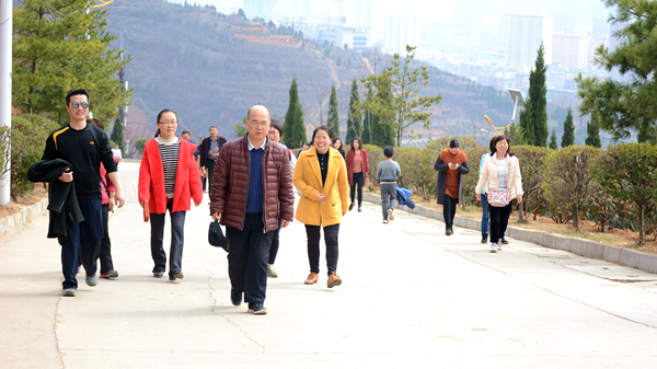 位于商洛市中心廣場(chǎng)北邊的金鳳山,有寬闊的水泥路和蜿蜒曲折的臺(tái)階通往山頂,參加活動(dòng)的教職工們熱情高漲、意趣盎然,三五成群結(jié)伴而行,一邊呼吸著新鮮空氣,一邊飽覽自然美景,或大步流星拾級(jí)而上,或相互鼓勵(lì)穩(wěn)步前行,一路灑下歡歌笑語(yǔ)。待到山頂極目遠(yuǎn)眺,周邊風(fēng)景盡收眼底,美麗的丹江宛若玉帶穿城而過(guò),一幢幢高樓沿江林立,一條條公路向遠(yuǎn)方延伸,春風(fēng)伴著美景,令人心曠神怡,大家紛紛合影留念,定格快樂(lè)。