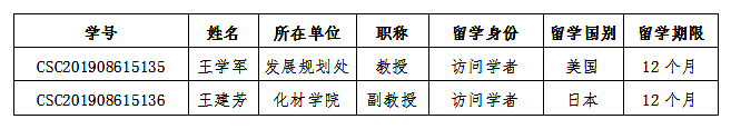 近日,國(guó)家留學(xué)基金委發(fā)布2019年西部地區(qū)人才培養(yǎng)特別項(xiàng)目(以下簡(jiǎn)稱“西部項(xiàng)目”)錄取名單,我校發(fā)展規(guī)劃處王學(xué)軍教授,化材學(xué)院王建芳副教授獲得該項(xiàng)目的錄取資格,獲批公派出國(guó)留學(xué)一年。