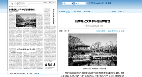 我校人文學(xué)院教師李小奇在《光明日?qǐng)?bào)》2019年7月29日文史哲周刊發(fā)表學(xué)術(shù)文章《園林游記文學(xué)書寫的園林特性》,全文如下: