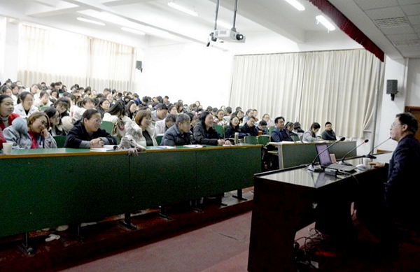 報告會上,曾大興對文學地理學這一新興學科進行了詳細介紹,并運用文學地理學的理論和方法對《九月九日憶山東兄弟》《江雪》《漁家傲》《江城子(乙卯正月二十日夜記夢)》等多篇古典詩歌經(jīng)典作品進行了解讀。曾教授優(yōu)雅的談吐,淵博的知識,風趣的語言,獲得了現(xiàn)場師生熱烈的掌聲。