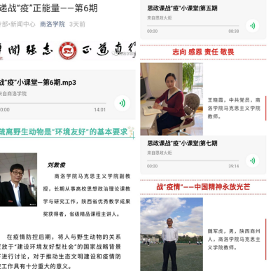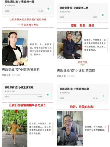 為貫徹落實(shí)習(xí)近平總書記關(guān)于新冠肺炎疫情防控工作的重要講話和指示精神,全力支持配合打贏疫情防控戰(zhàn)、總體戰(zhàn)、阻擊戰(zhàn),按照教育部黨組“停課不停教、停課不停學(xué)”的要求,積極響應(yīng)教育部舉辦的高?!八颊n戰(zhàn)役小課堂”專項(xiàng)活動(dòng),助力思政課線上教學(xué),我校馬克思主義學(xué)院通過(guò)微信公眾號(hào)開辦了“思政課戰(zhàn)疫小課堂”專題欄目,組織學(xué)院教師錄制思政微課,通過(guò)文字、圖片加音頻的形式定期向?qū)W生推送,同時(shí)還通過(guò)學(xué)校官方微信公眾號(hào)進(jìn)行推送,以擴(kuò)大學(xué)生覆蓋面。目前,“思政課戰(zhàn)役小課堂”已經(jīng)發(fā)布7期內(nèi)容,獲得了師生廣泛關(guān)注,進(jìn)一步激發(fā)了師生從我做起、助力抗疫的積極性和自覺性,堅(jiān)定了青年一代勇?lián)鷷r(shí)代使命的決心和信心。