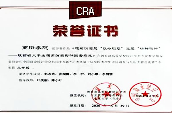 此次大賽省選拔賽共有來自西北大學(xué)、陜西師范大學(xué)、西安財(cái)經(jīng)大學(xué)、長安大學(xué)、西安石油大學(xué)等20多所高校的108支隊(duì)伍參加。學(xué)校高度重視此次大賽,參賽學(xué)生自2019年10月開始積極備賽,在教務(wù)處、數(shù)學(xué)與計(jì)算機(jī)應(yīng)用學(xué)院等相關(guān)單位的大力支持以及多位老師的悉心指導(dǎo)下,經(jīng)過專業(yè)知識(shí)個(gè)人網(wǎng)考、實(shí)踐賽校內(nèi)選拔,共有兩支隊(duì)伍進(jìn)入陜西省賽區(qū)選拔賽。經(jīng)過激烈比拼,參賽隊(duì)伍憑借詳實(shí)規(guī)范的統(tǒng)計(jì)調(diào)查方案和數(shù)據(jù)分析報(bào)告以及大方得體的線上表現(xiàn),由我校應(yīng)用統(tǒng)計(jì)學(xué)專業(yè)17級(jí)學(xué)生彭永玲、張瑞騰、李滬、劉小翠、李博雅代表隊(duì)的作品《超前消費(fèi)是“救命稻草”還是“精神鴉片”——陜西省大學(xué)生超前消費(fèi)影響因素探究》榮獲國家三等獎(jiǎng)。