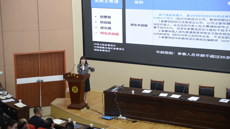啟動儀式結(jié)束后,楊丹為師生作了專題輔導(dǎo)報告。她結(jié)合多年“互聯(lián)網(wǎng)+”大賽指導(dǎo)經(jīng)驗(yàn),分別從大賽背景、規(guī)則解讀、項(xiàng)目溯源、評審視角、備賽要點(diǎn)五個方面,全面細(xì)致、深入淺出的為師生剖析了本屆“互聯(lián)網(wǎng)+”大賽的目標(biāo)任務(wù)、賽項(xiàng)制度和關(guān)鍵環(huán)節(jié),重點(diǎn)介紹了備賽、預(yù)賽、省賽等不同階段的目標(biāo)任務(wù)。
