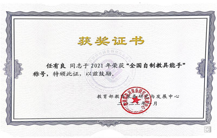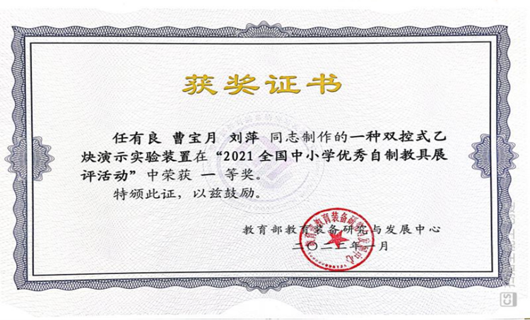 近日,教育部教育裝備研究與發(fā)展中心舉辦了“2021全國中小學(xué)優(yōu)秀自制教具展評活動(dòng)”,我校化學(xué)工程與現(xiàn)代材料學(xué)院教師任有良、曹寶月、劉萍的參展作品“一種雙控式乙炔演示實(shí)驗(yàn)裝置”獲全國一等獎(jiǎng),任有良獲“全國自制教具能手”稱號。