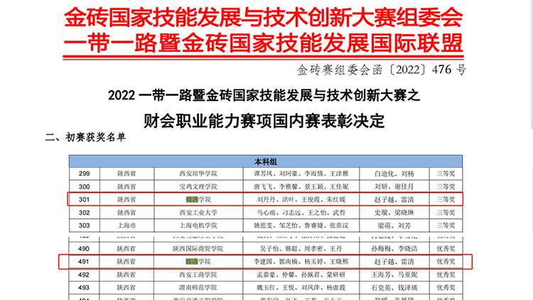近日,“2022一帶一路暨金磚國家技能發(fā)展與技術(shù)創(chuàng)新大賽”等多項財會類專業(yè)高水平競賽結(jié)果陸續(xù)公布,我校經(jīng)濟(jì)管理學(xué)院參賽師生捷報頻傳,在4項競賽中榮獲省級獎勵。