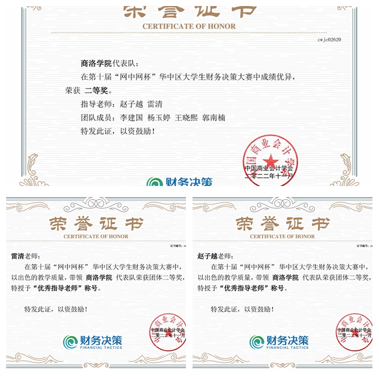 第十屆“網(wǎng)中網(wǎng)杯”大學(xué)生財務(wù)決策大賽由中國高等教育學(xué)會高等財經(jīng)教育分會指導(dǎo),中國商業(yè)會計學(xué)會主辦,廈門網(wǎng)中網(wǎng)軟件有限公司等單位提供技術(shù)支持,全國共有372所本科院校參賽。我校經(jīng)濟(jì)管理學(xué)院李建國、楊玉婷、王曉熙、郭南楠4名學(xué)生獲得華中區(qū)團(tuán)體二等獎,雷清、趙子越榮獲“優(yōu)秀指導(dǎo)教師”稱號。