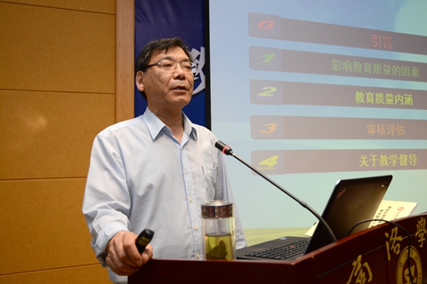 研討會上,韓江水教授作了《審核評估與教學督導》的主題報告。報告分析了當前高等教育面臨的形勢與任務、內部與外部環(huán)境、機遇與挑戰(zhàn),指出以提升教學質量為核心的內涵式發(fā)展已經成為高等教育的主題,高校教育綜合改革已經展開,地方本科高校轉型發(fā)展不斷深化。報告從影響教育質量的因素、如何提高與保障教育質量、審核評估、關于教學督導的思考四部分,進行了詳細、系統(tǒng)地講解,分析了教學督導職能的變革與轉變、督導工作方式方法的創(chuàng)新,提出了“三督一專兩機一平”的督導模式。