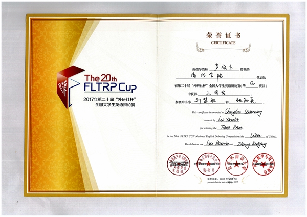 4月28日至30日,第二十屆“外研社杯”全國(guó)大學(xué)生英語(yǔ)辯論賽華西賽區(qū)決賽在四川外國(guó)語(yǔ)大學(xué)舉行。我校語(yǔ)言文化傳播學(xué)院2014級(jí)英語(yǔ)專業(yè)學(xué)生劉慧敏、2013級(jí)英語(yǔ)專業(yè)學(xué)生張凱英榮獲三等獎(jiǎng)。通過(guò)參賽,選手們既開闊了視野,增長(zhǎng)了知識(shí),提高了英語(yǔ)口語(yǔ)能力,又鍛煉了思維能力和表達(dá)能力。
